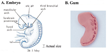 Figure 4. Comparing the appearance of an embryo at the mudghah stage with a piece of gum that has been chewed. A, an embryo at around 26 days showing several pairs of bead-like somites. (The Developing Human, Moore and Persaud, 5th ed., p. 79.) B, a piece of gum that has been shaped like an embryo and then chewed. Note how the teeth marks on the chewed substance resemble somites of the embryo. The somites represent the beginnings or primordia of the vertebrae.[7]