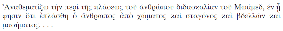 [6] A Byzantine anathema recorded during Muslim conversions to Christianity reads: “I anathematize Muhammad’s teaching about the creation of man, where he says that man was created from dust and a drop of fluid [σταγόνος] and leeches [βδἑλλων] and chewed-like substance [μασήματος]…”